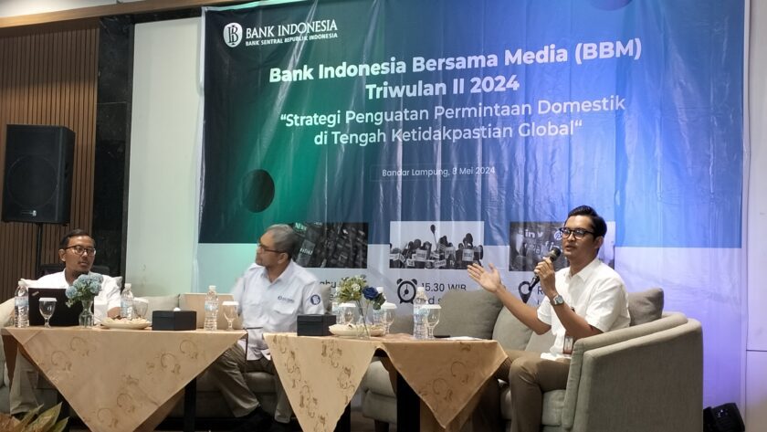 PASS.COM , BANDAR LAMPUNG – Bank Indonesia (BI) Perwakilan Lampung, menggelar acara Bank Indonesia bersama Media (BBM) Triwulan ll 2024 di Bukit Randu Resto Rabu ( 8/5/2024) dengan mengusung tema. ” Strategi Penguatan Permintaan Domestik di Tengah Ketidak Pastian Global ”