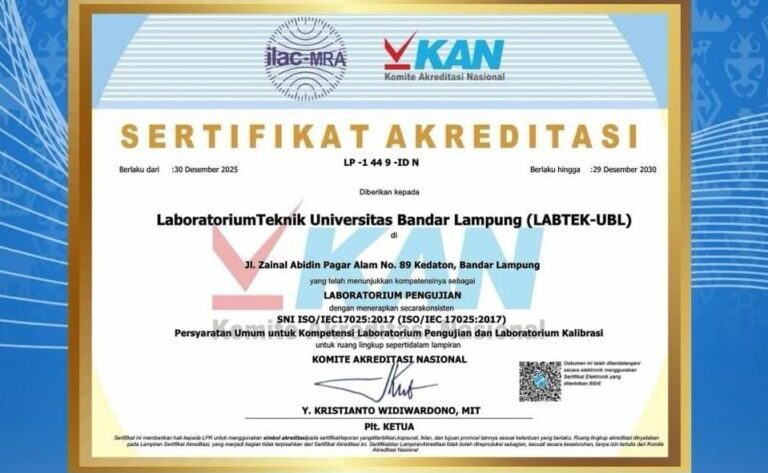 PAS-S.COM- Bandar Lampung – Sebagai wujud komitmen dalam menjaga mutu layanan pengujian dan penguatan daya saing institusi, Laboratorium Teknik Universitas Bandar Lampung (LABTEK-UBL) terus melakukan peningkatan standar dan kompetensi laboratorium secara berkelanjutan. Hal ini dibuktikan dengan diraihya Sertifikat Akreditasi Komite Akreditasi Nasional (KAN) sebagai Laboratorium Pengujian yang kompeten serta memenuhi standar nasional dan internasional. Akreditasi ini diberikan setelah LABTEK-UBL dinyatakan konsisten menerapkan SNI ISO/IEC 17025:2017, standar yang mengatur persyaratan umum kompetensi laboratorium pengujian dan kalibrasi.