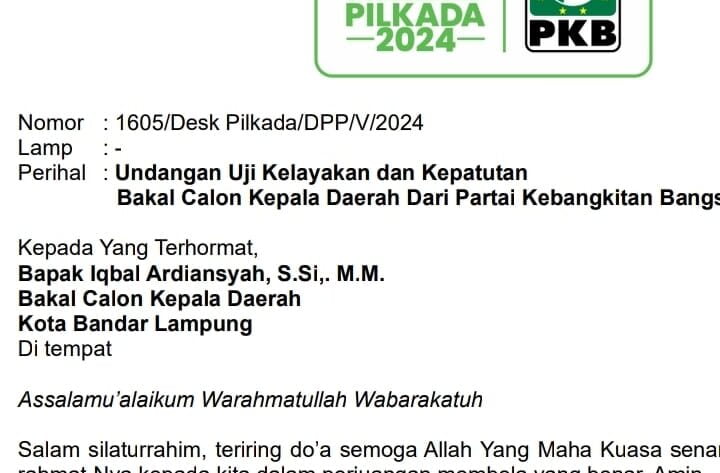 Pas-s.com- Bandar Lampung -Langkah Bakal calon walikota Bandar Lampung Iqbal Ardiansyah S.Si MM melaju pada Pilkada 2024 semakin terbuka. Setelah mendapat dukungan sejumlah tokoh partai, kali ini mendapat undangan mengikuti uji kelayakan dan kepatutan (fit and proper test) dari Desk Pilkada DPP PKB.