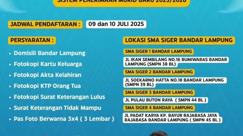 PAS-S.COM- Bandar Lampung — Pemerintah Kota Bandar Lampung membuka pendaftaran peserta didik baru tahun ajaran 2025/2026 untuk jenjang Sekolah Menengah Atas (SMA) yang dikelola oleh Yayasan Siger Prakarsa Bunda. Proses pendaftaran akan berlangsung selama dua hari, yakni pada tanggal 9 hingga 10 Juli 2025.