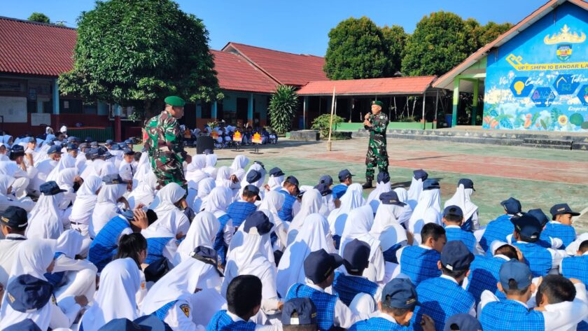 PAS-S.COM- BANDAR LAMPUNG, 22 September 2025 – Dalam rangka menanamkan nilai-nilai kebangsaan dan jiwa patriotisme sejak dini, anggota Koramil 410-05/Tanjung Karang Pusat (TKP), yang dipantau langsung oleh Babinsa Kelurahan Segala Minder, Peltu Nurdin, melaksanakan program “Babinsa Go to School” di SMP Negeri 10 Kota Bandar Lampung, Senin pagi.