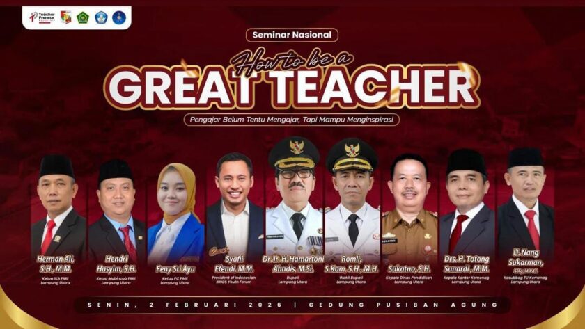 PAS-S.COM- Lampung Utara, 2 Februari 2026 – PC PMII Lampung Utara berkolaborasi dengan Teacherpreneur dan didukung oleh Pemkab Lampung Utara, Dinas Pendidikan Lampung Utara, dan Kemenag Lampung Utara, menggelar Seminar Nasional dengan tema “Pengajar Belum Tentu Mengajar, Tapi Mampu Menginspirasi” di Gedung Pusiban. Kegiatan ini dihadiri oleh 3.000 peserta, terdiri dari 1.500 guru naungan Dinas Pendidikan Lampung Utara dan 1.500 guru naungan Kemenag Lampung Utara.