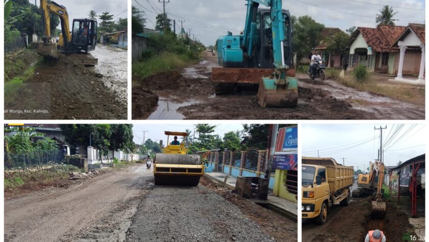 Di ruas Kali Rejo – Bangun Rejo, petugas melakukan pengerukan saluran air serta penimbunan jalan berlubang agar tetap dapat dilalui kendaraan masyarakat dengan aman.
