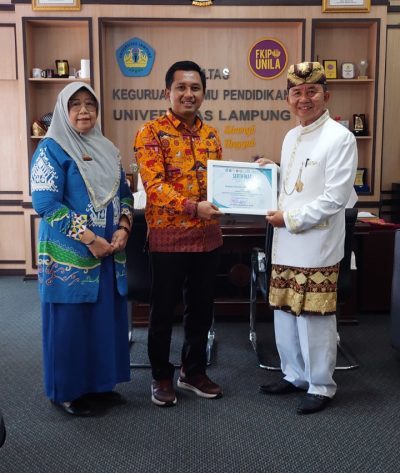 Sebagai bentuk apresiasi atas kontribusi beliau, sertifikat penguji praktisi diserahkan langsung oleh Dr. Albet Maydiantoro, M.Pd. Dekan FKIP Unila.