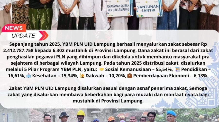 PAS-S.COM- Lampung – Sepanjang tahun 2025, YBM PLN UID Lampung menyalurkan zakat sebesar Rp 2,4 miliar kepada 6.302 mustahik di berbagai wilayah Provinsi Lampung. Dana …