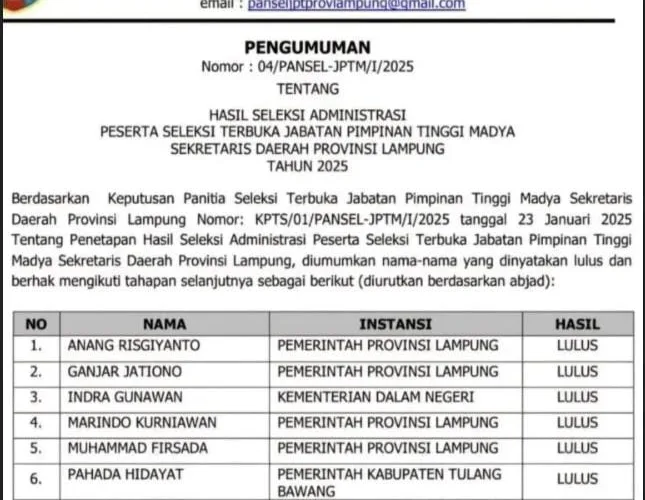 Pas-s.com – Bandar Lampung – Pansel seleksi jabatan pimpinan tinggi madya Sekda Provinsi Lampung telah mengumumkan nama calon Sekda Lampung yang lulus administrasi. Sembilan …