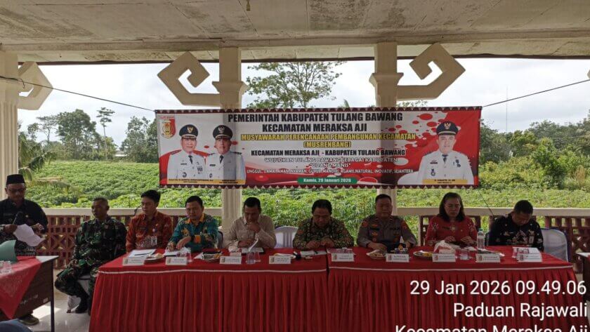 Musrenbang tersebut dipimpin langsung oleh Camat Meraksa Aji Sumantri, SE, MM, dan turut dihadiri oleh Anggota DPRD Kabupaten Tulang Bawang Dapil 7 Holil, S.H., unsur TNI, KUA, PKK, BPK, kepala kampung, serta jajaran Tim OPD Kabupaten Tulang Bawang dari berbagai dinas teknis.